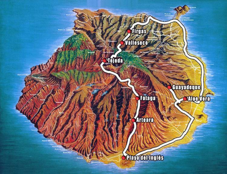 Het ravijn van Guayadeque is ongetwijfeld een van de interessantste plekken op het eiland Gran Canaria, vanwege de groene en overvloedige vegetatie en de beroemde grotwoningen, waar sommige inwoners wonen en bedrijven hebben, zoals een cafetaria waar we zullen stoppen om onze batterijen op te laden. Firgas, de kleinste gemeente van Gran Canaria maar met een zeer unieke charme en de Aloë Vera plantage zal een ander hoogtepunt van de excursie zijn.